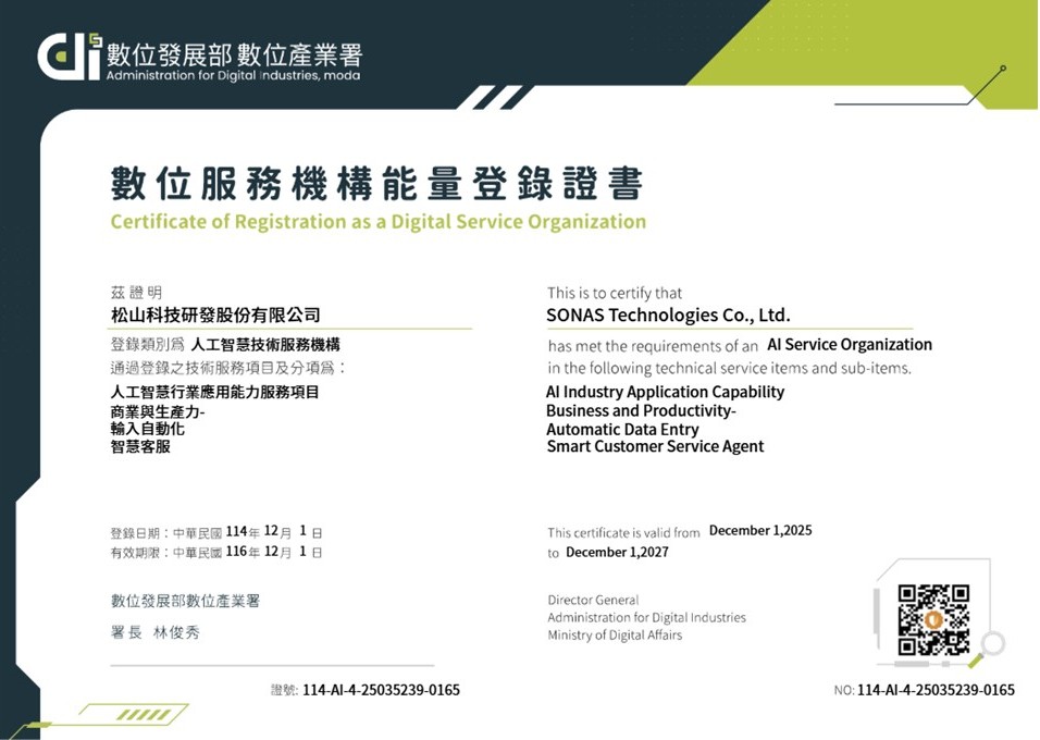 榮獲國家級認可!松山科技(SONAS Technologies)通過數位發展部「AI能量登錄」